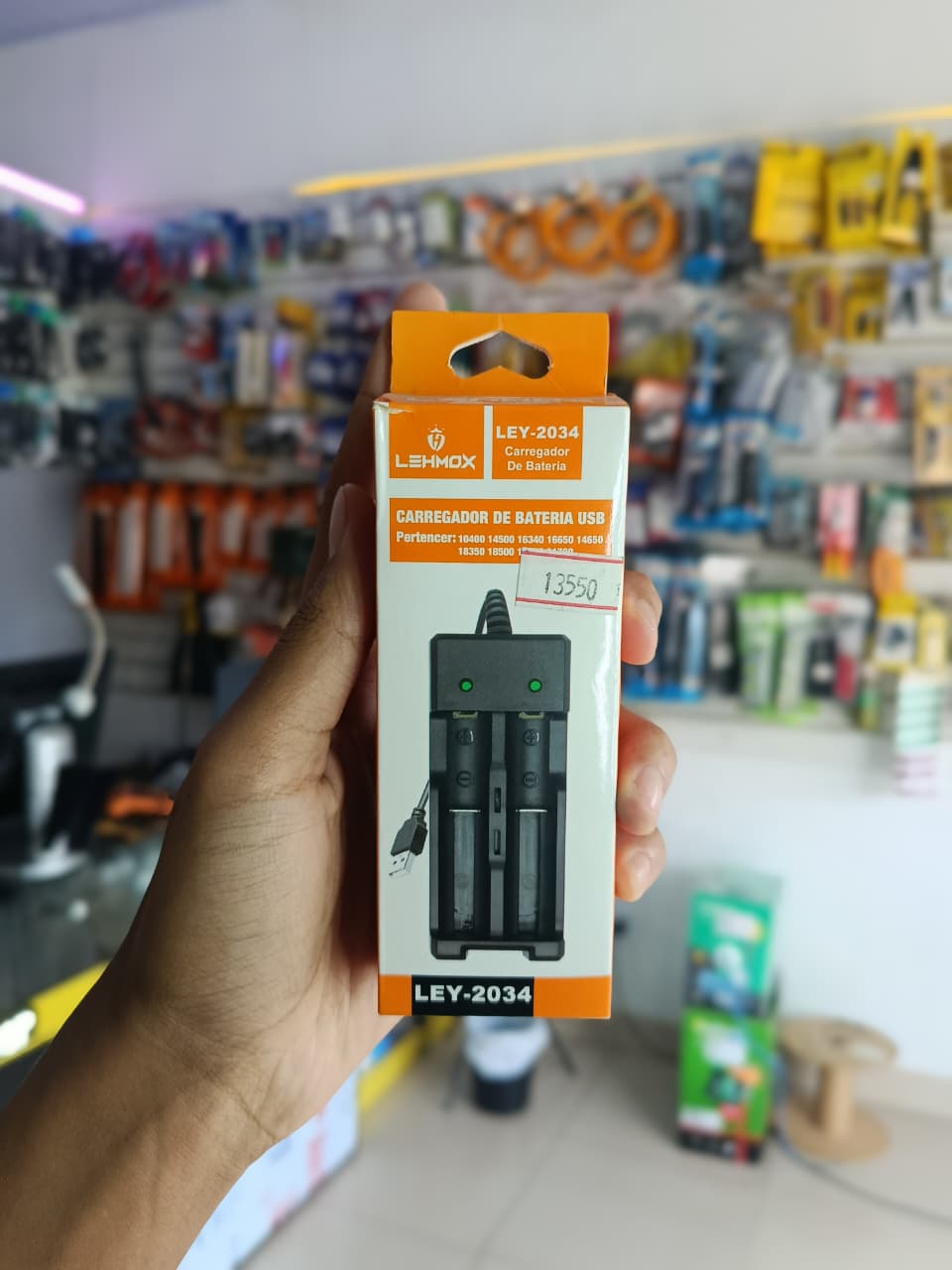 Carregador de bateria Lehmox via USB, prático e portátil.