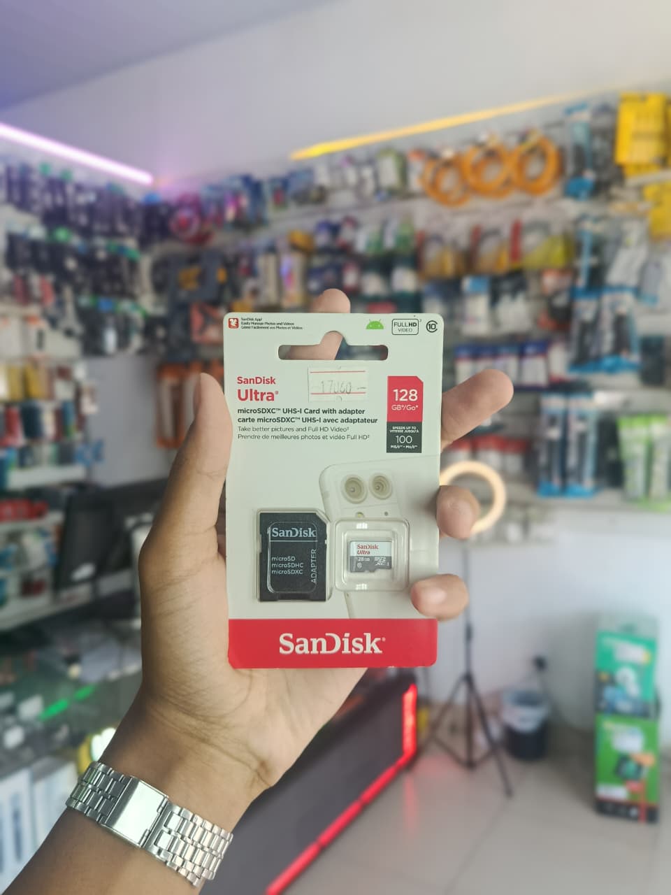 O QUE VOCÊ RECEBE EM SUA CASA: – 1 Cartão MicroSD + Adaptador SD da marca Sandisk modelo ULTRA SDXC UHS-1 com capacidade de 128GB + Adaptador SD.
