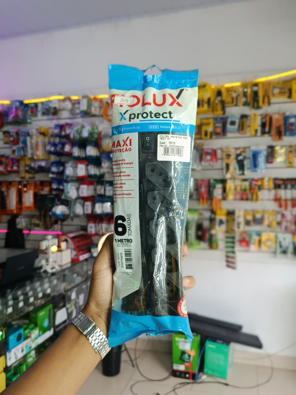 Filtro protetor Protect com 6 tomadas, ideal para proteger seus equipamentos elétricos.