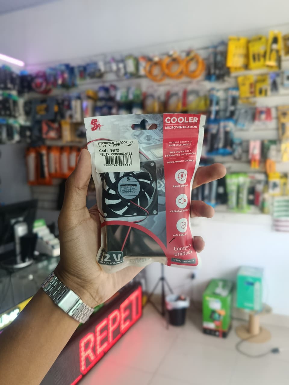 Este microventilador possui dimensões de 70mm x 70mm x 15mm, tornando-se uma opção ideal para espaços reduzidos. Sua alimentação é de 12V, garantindo um funcionamento estável e seguro.