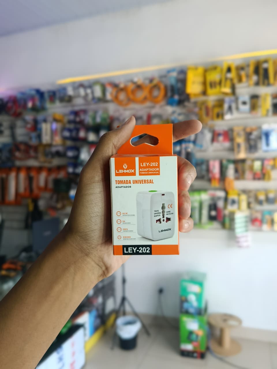 Adaptador universal Lehmox para plugs estrangeiros, prático e seguro.